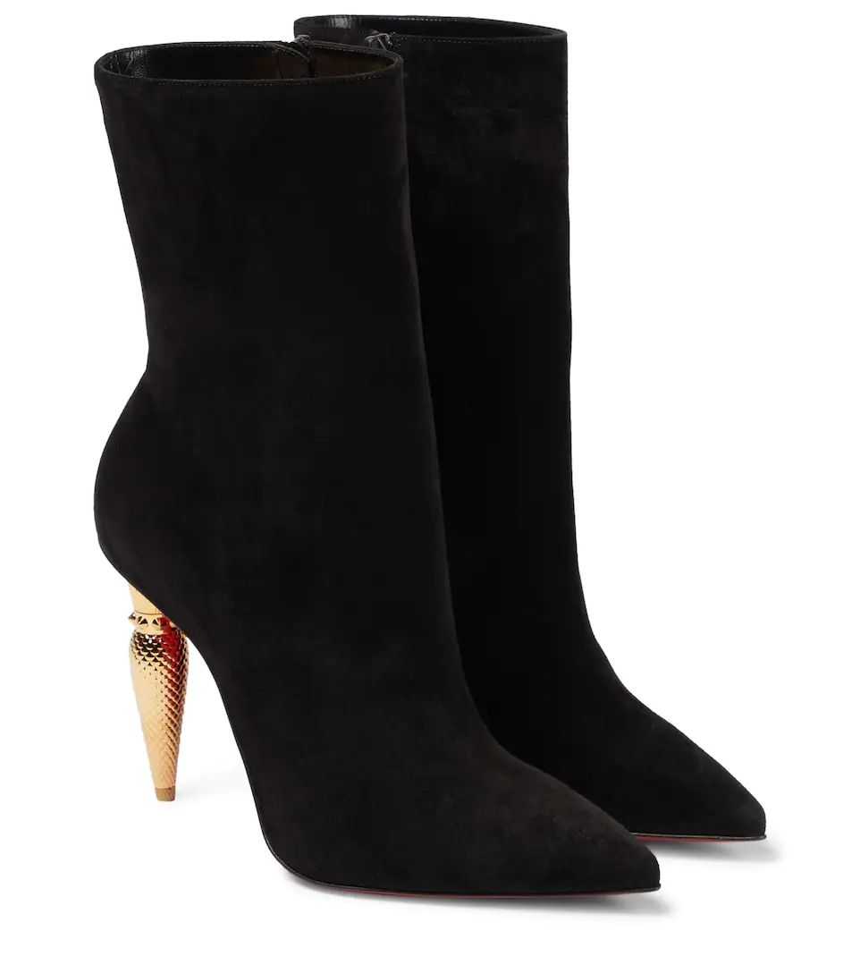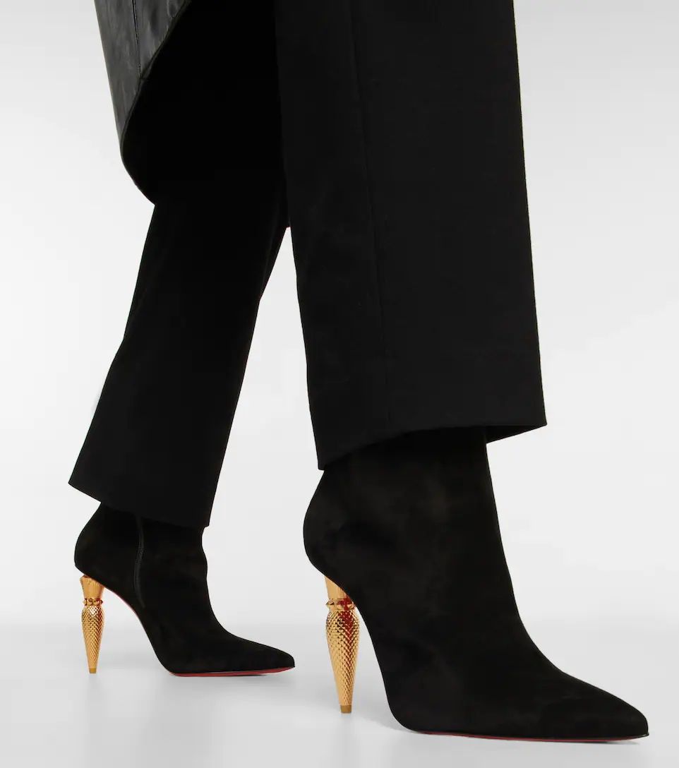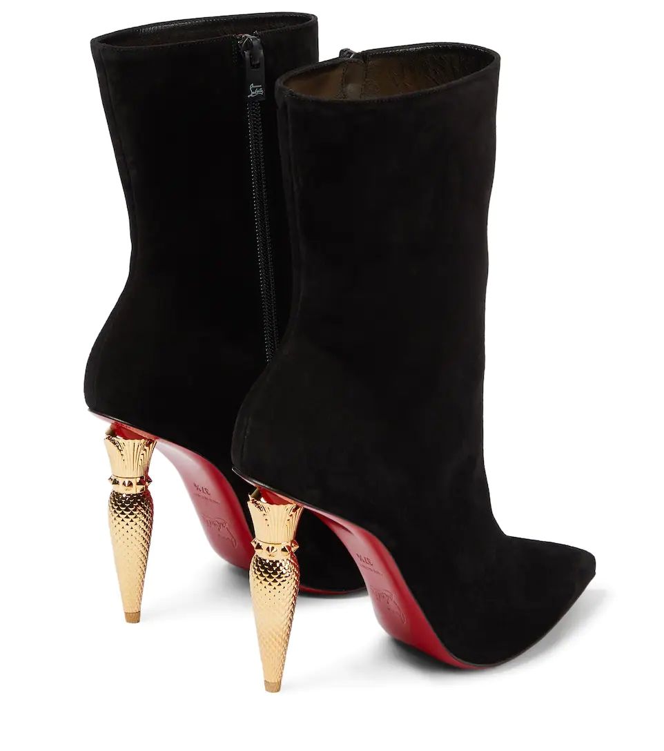 Featuring unique curved metal heels that mirror the label's signature lipstick bottle, the Lipbooty ankle boots from Christian Louboutin are made from suede and have pointed toes.