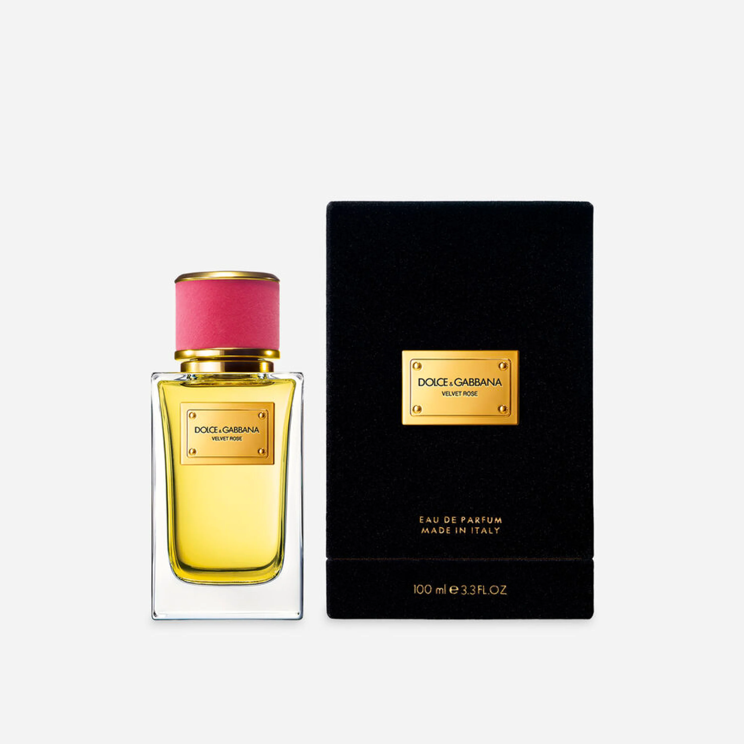 The iconic, weighty glass bottle of the Dolce&Gabbana Velvet Collection is topped with a dusky pink velvet-trimmed stopper with golden accents. The flacon of Dolce&Gabbana Velvet Rose Eau de Parfum is also personalized with an engraved golden plate, and comes encased in a black velvet coffret.