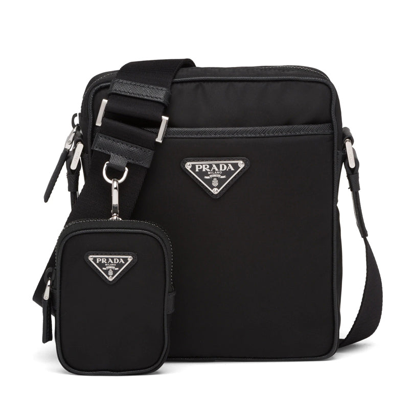 機能的でモダンなデザインのナイロン ショルダーバッグ。取り外し可能なポーチのトリック、ゆとりある内側の収納部分が際立ちます。「サフィアーノ」レザー(牛革)トリムのアクセントがあしらわれています。
