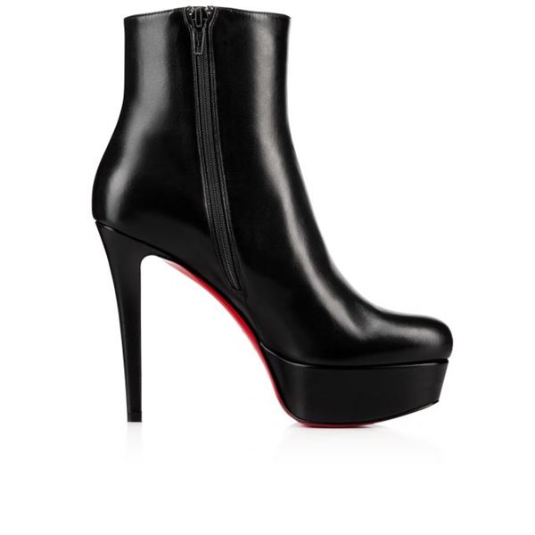 Christian Louboutin's signature classic Bianca returns as a shiny black Nappa leather ankle boot, with a gorgeous, sleek silhouette and almond toe. From its towering 120mm heights, this bootie shines above them all with class.