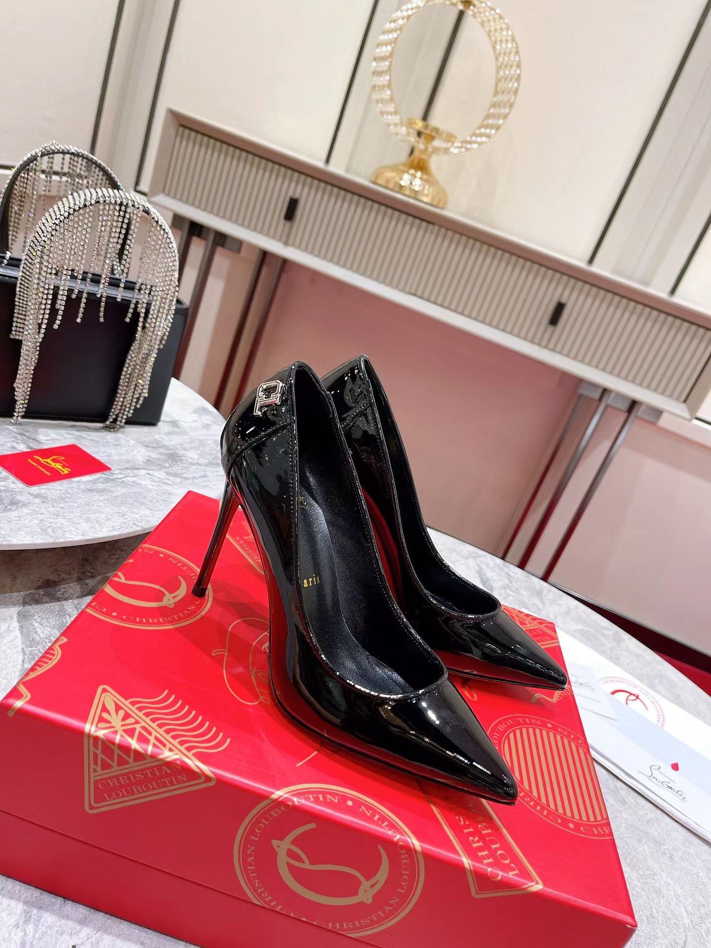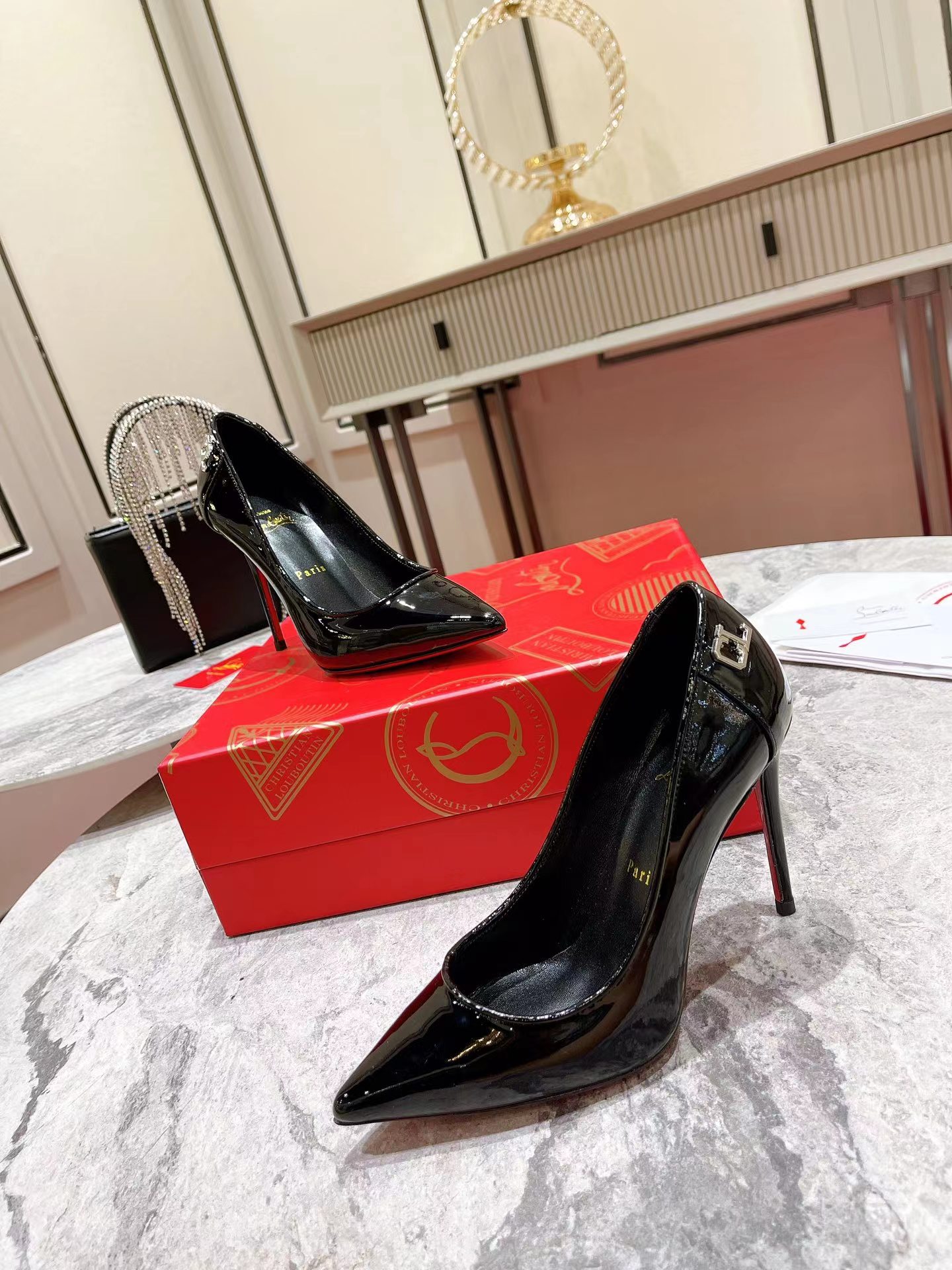 洗練された魅力を放つタイムレスでモダンな印象のパンプス、Sporty Kate。ポインテッドトウに足元をエレガントに演出するディープカットしたヴァンプを合わせ、85㎜ヒールで仕上げました。柔らかなブラックのパテントレザーを使用し、背面にはクリスチャン ルブタンのモノグラムが彩りを添えます。