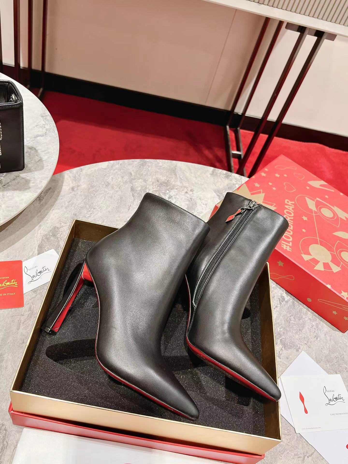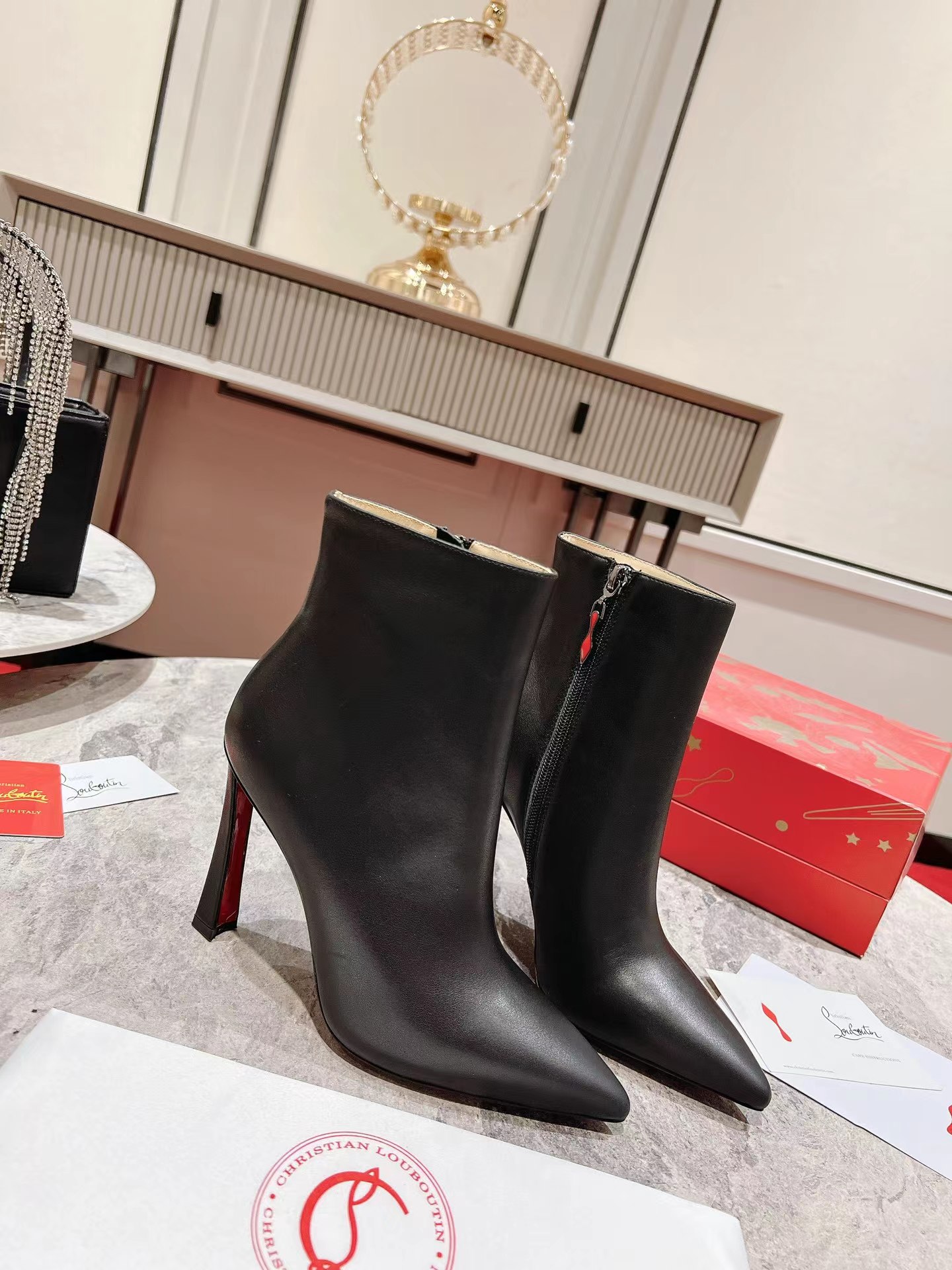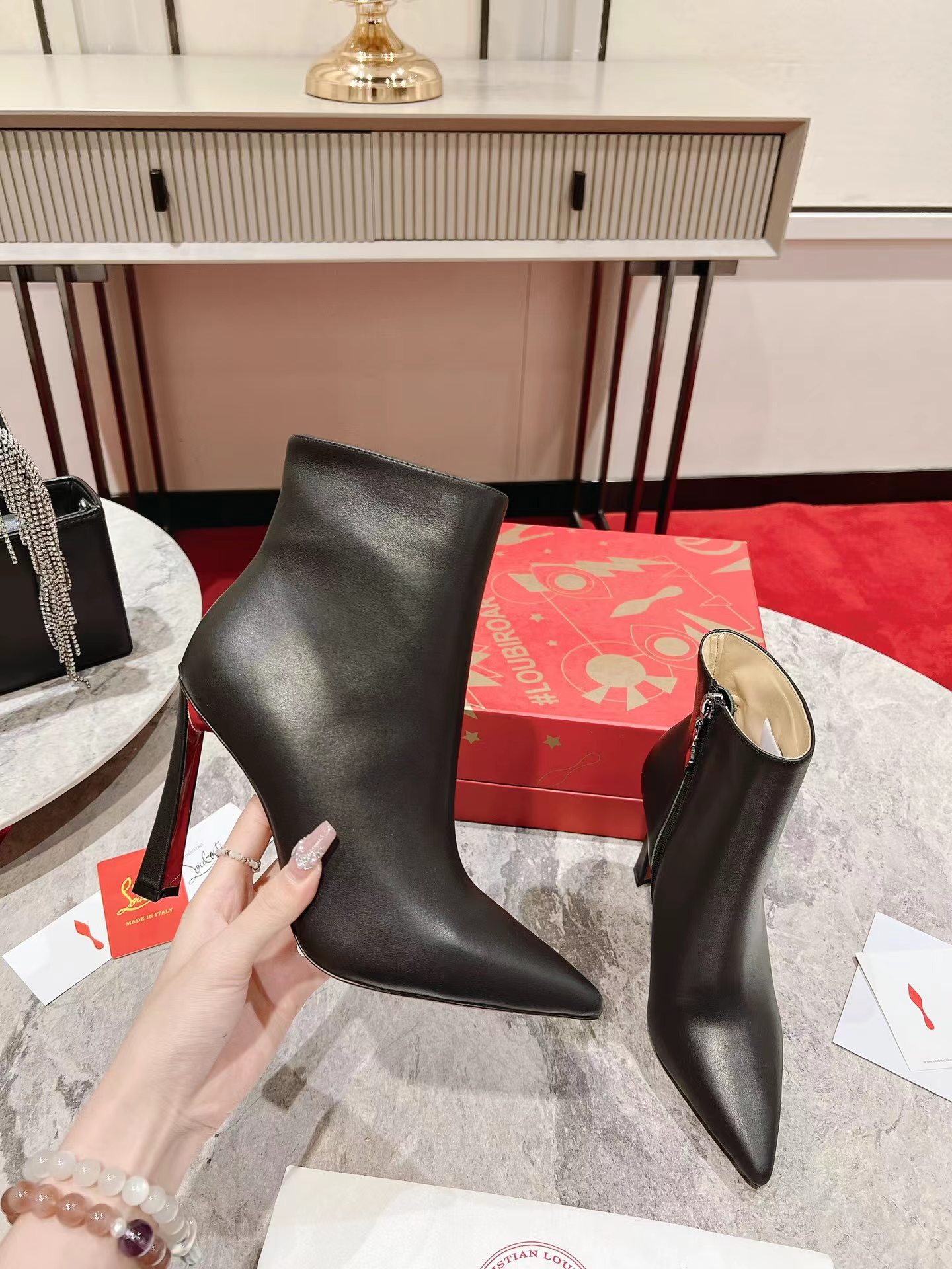 The sophisticated Condora Booty is an iconic shoe from Maison Christian Louboutin. Set on a 100 mm flared graphic plume heel, imbuing it with a modern yet contemporary allure and revealing the emblematic red sole. It is designed in premium black leather, fits the leg like a glove, and is embellished with an internal zip to elongate the silhouette. The pointed toe and delicate finishes enhance the model’s sleek and refined silhouette, making this an ideal match for any pants or skirt.