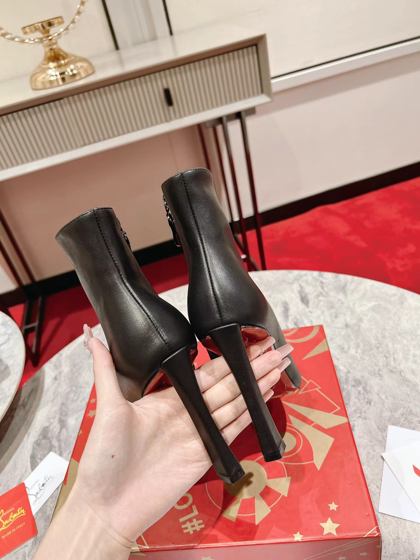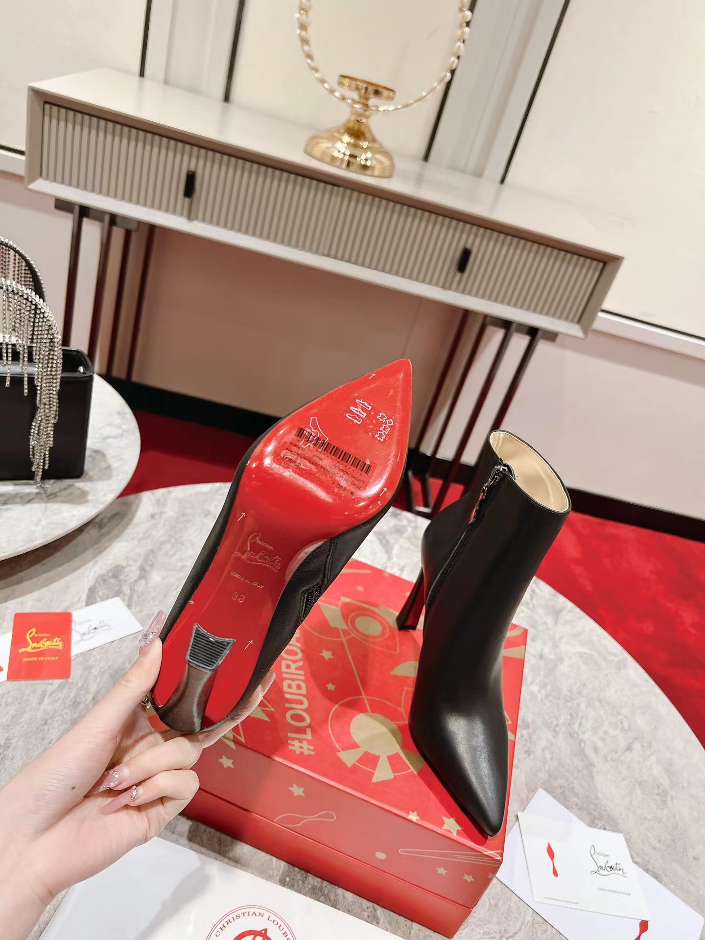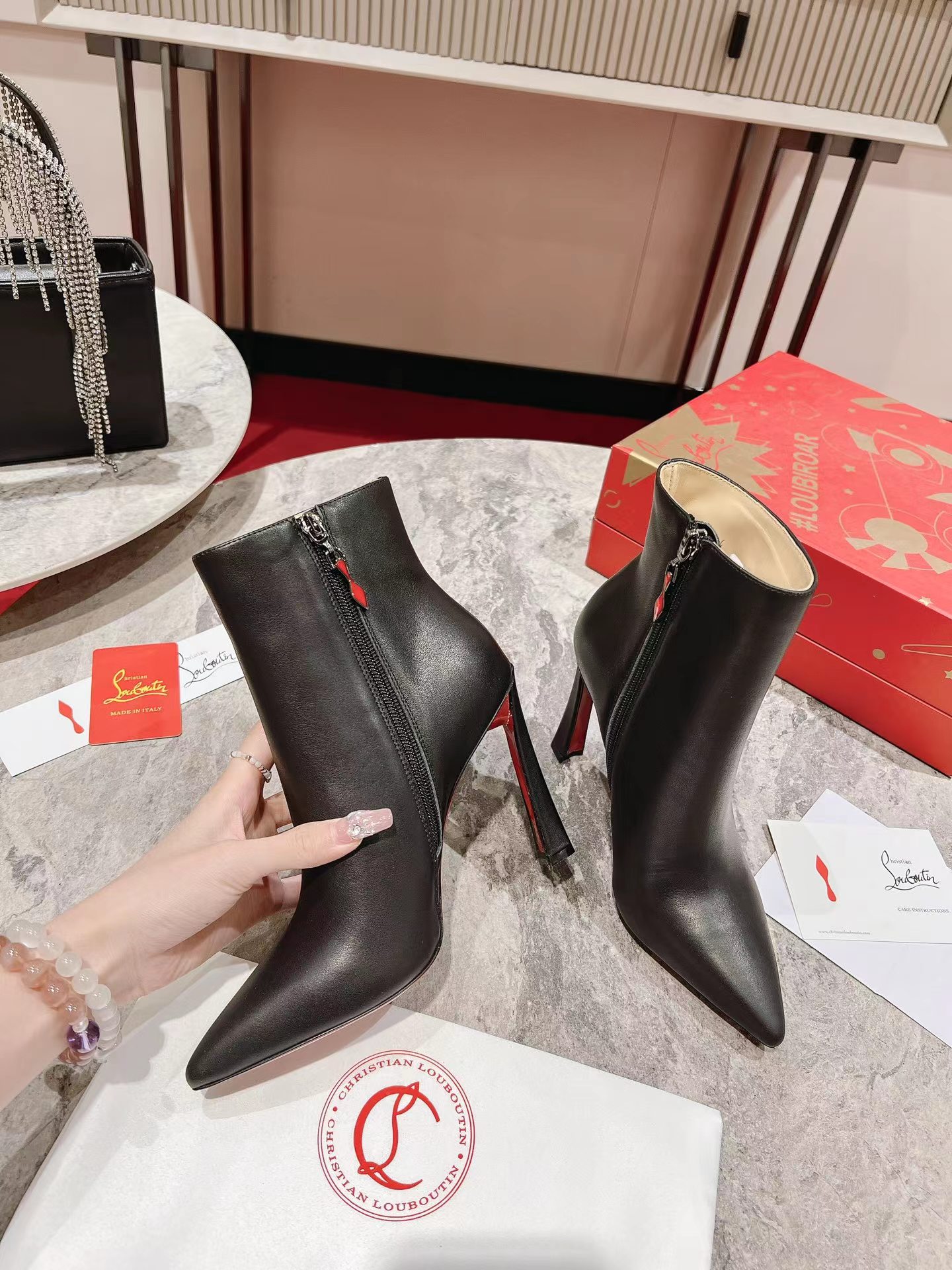 The sophisticated Condora Booty is an iconic shoe from Maison Christian Louboutin. Set on a 100 mm flared graphic plume heel, imbuing it with a modern yet contemporary allure and revealing the emblematic red sole. It is designed in premium black leather, fits the leg like a glove, and is embellished with an internal zip to elongate the silhouette. The pointed toe and delicate finishes enhance the model’s sleek and refined silhouette, making this an ideal match for any pants or skirt.