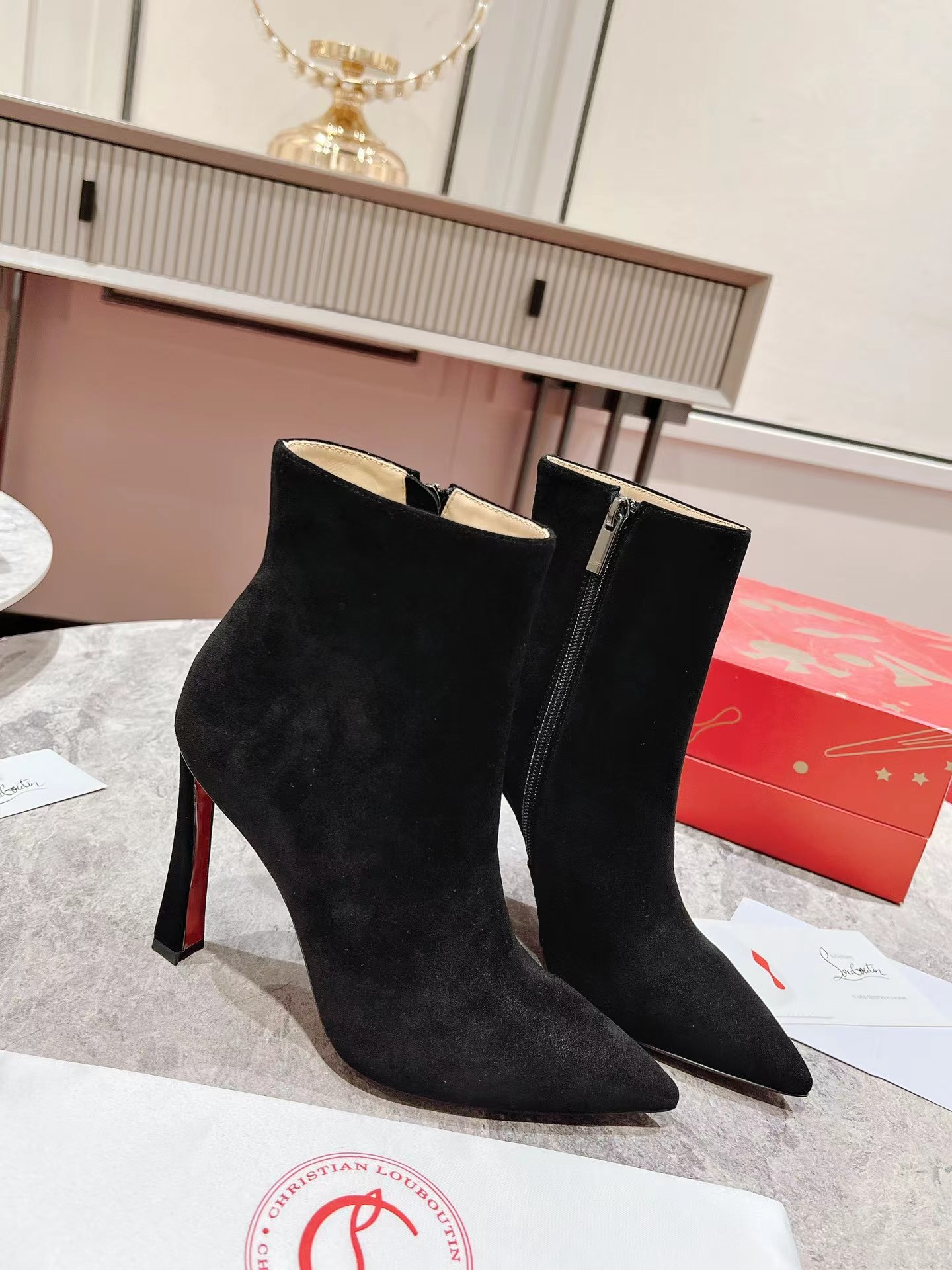 A thoroughly modern piece, the Condora Booty features Maison Christian Louboutin's architectural Plume heel, which reveals a flash of Loubi red. Set on a 100 mm heel, the sumptuous veau velours suede upper, features a straight cut across the ankle. This booty features a timeless stiletto boot design, with a zip closure on the inside and pointed toe.