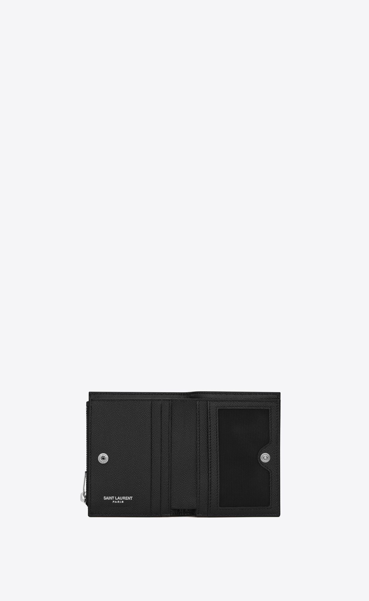 サンローランのカードバッグ。YSLの文字と金属製の接続部分、キルティングステッチで装飾されています。