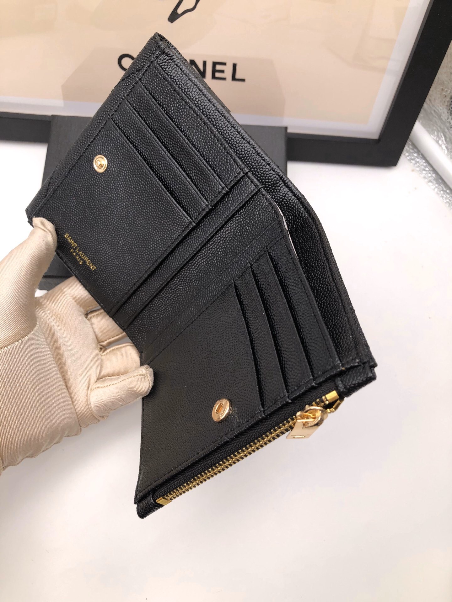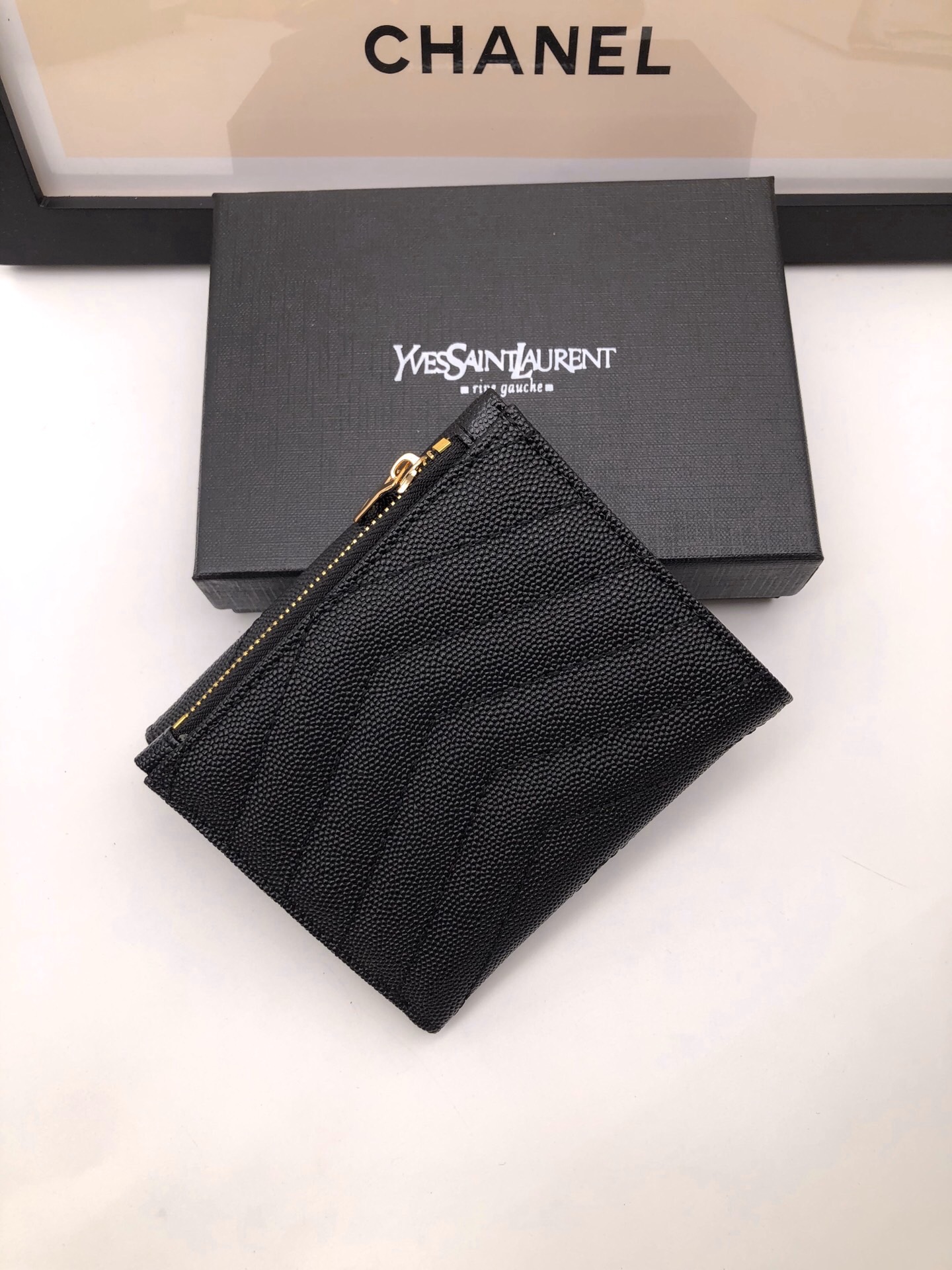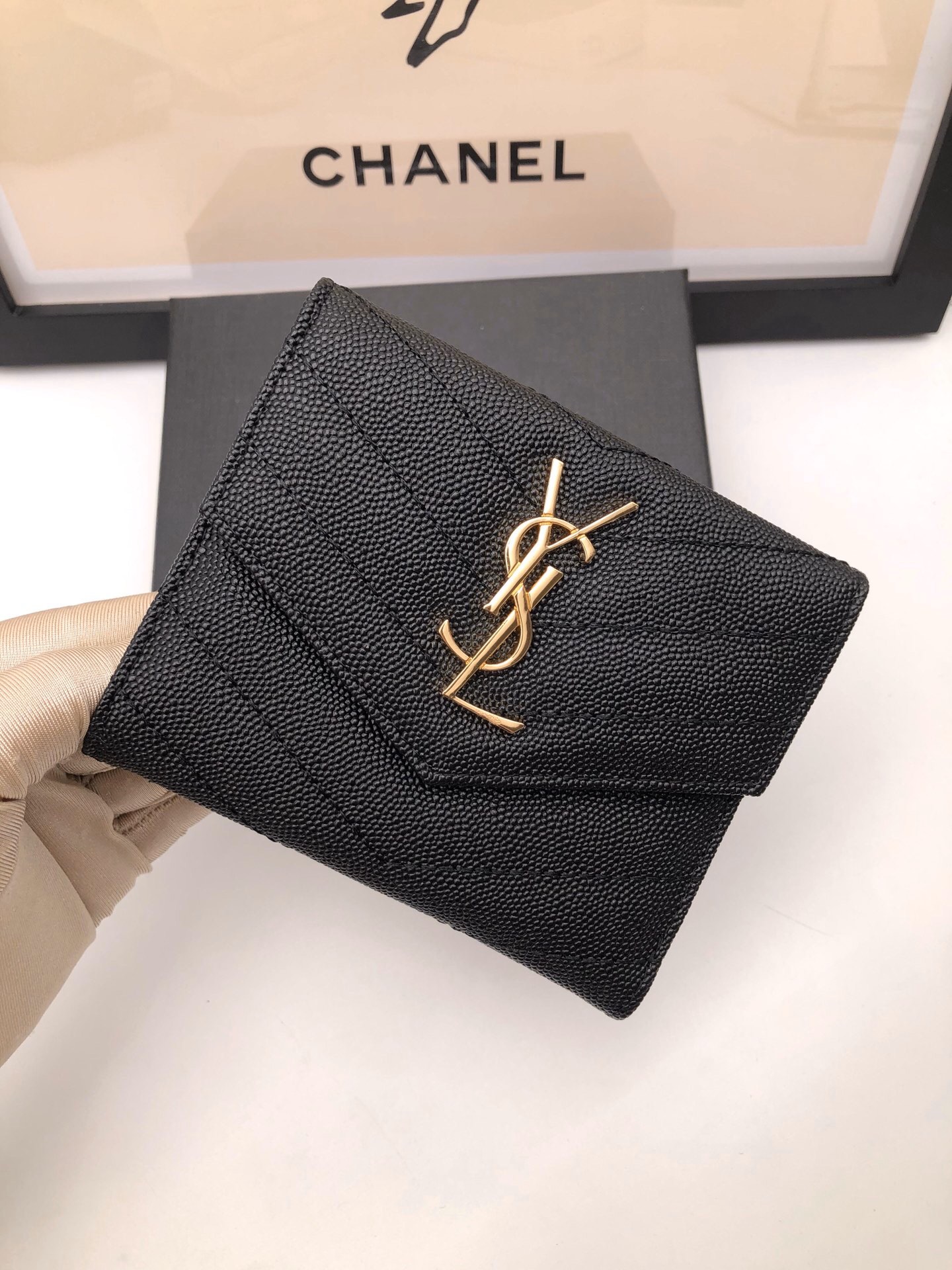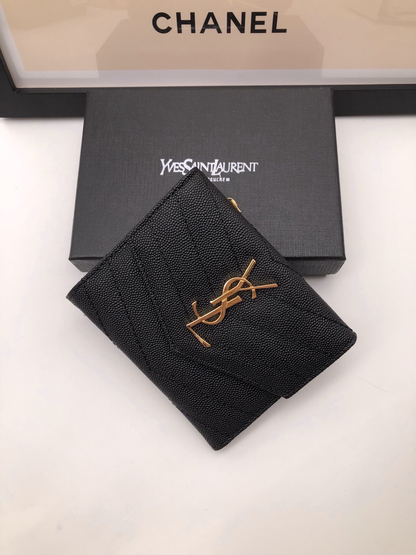 メタルフリータンニンモノグラムサンローランフラップウォレット。メタルの連結YSLイニシャル、キルティングのオーバーステッチが特徴です。
