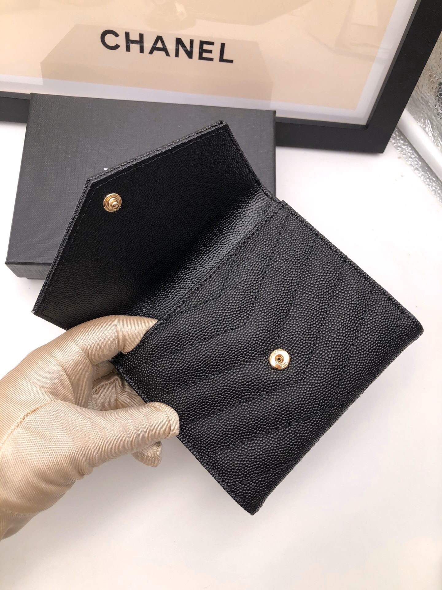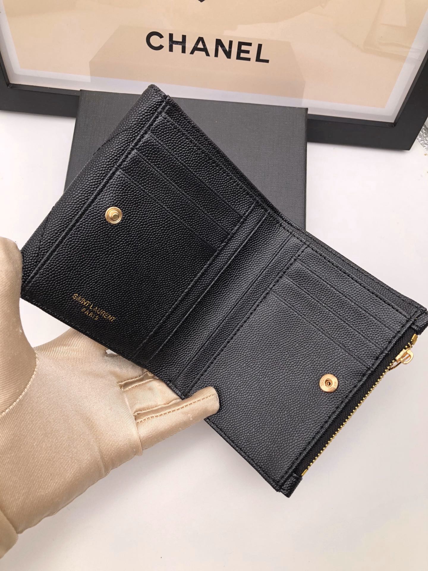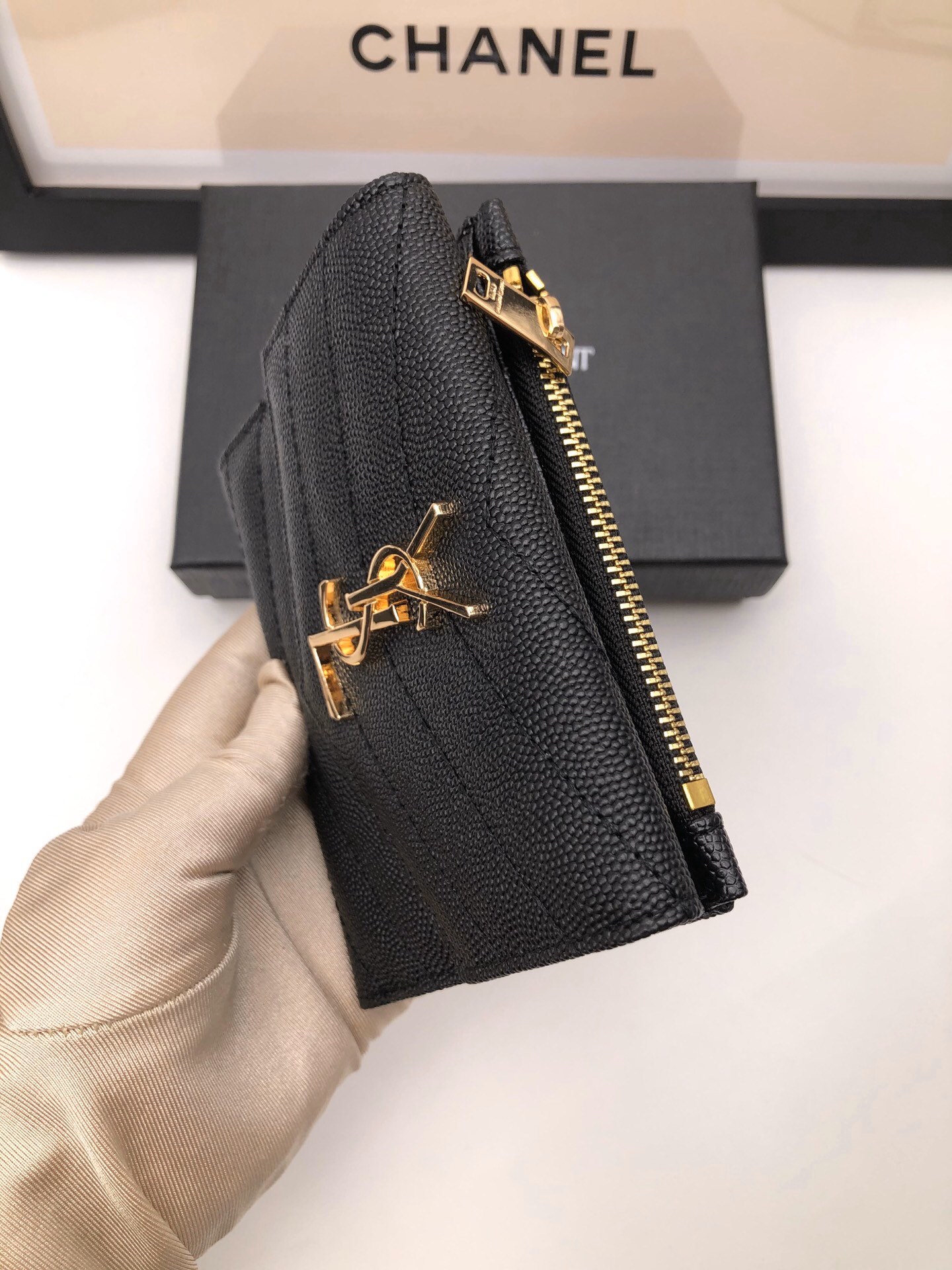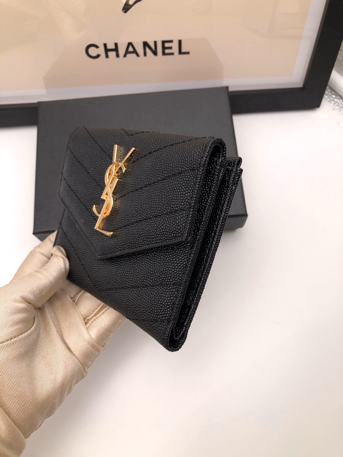 メタルフリータンニンモノグラムサンローランフラップウォレット。メタルの連結YSLイニシャル、キルティングのオーバーステッチが特徴です。